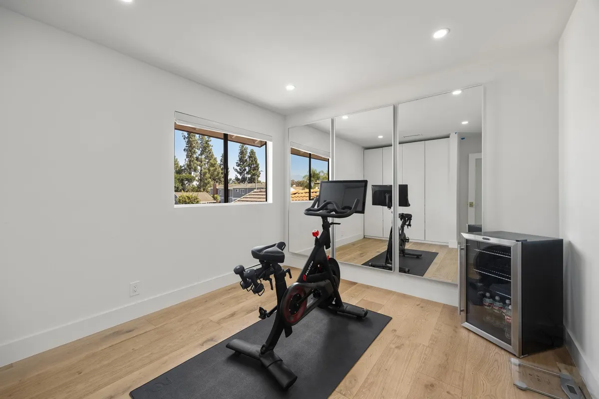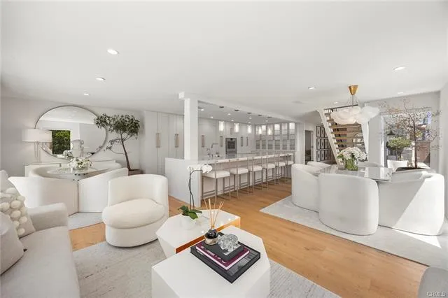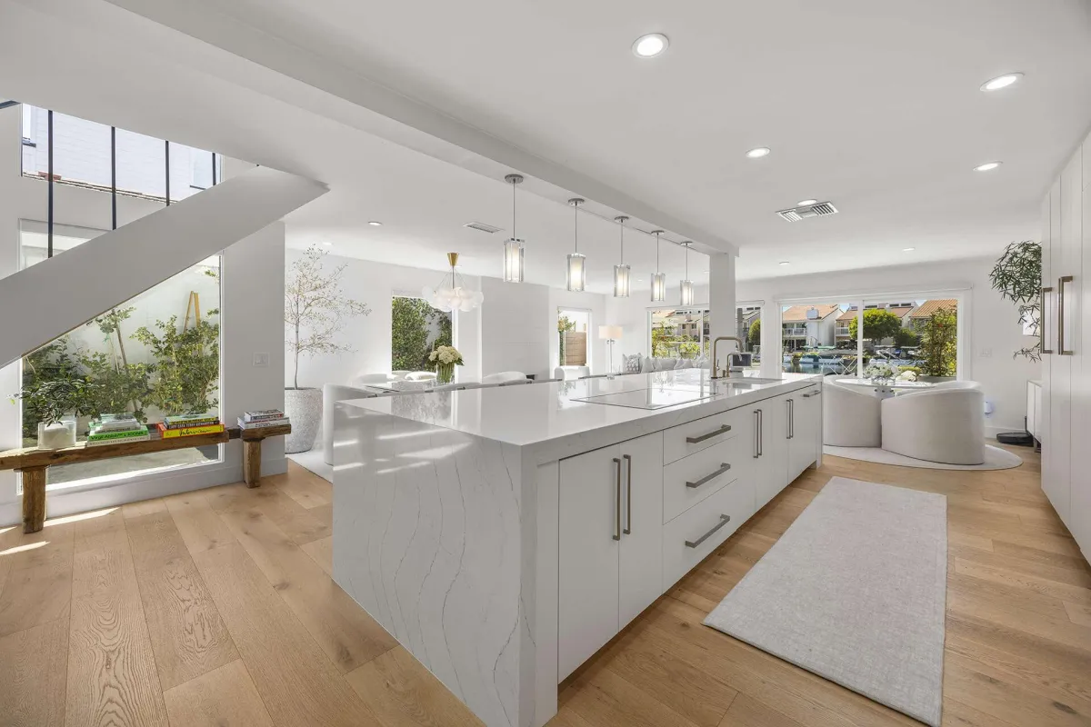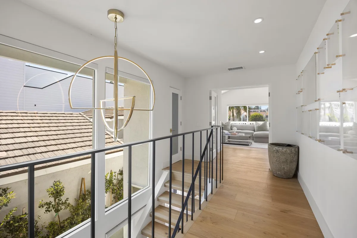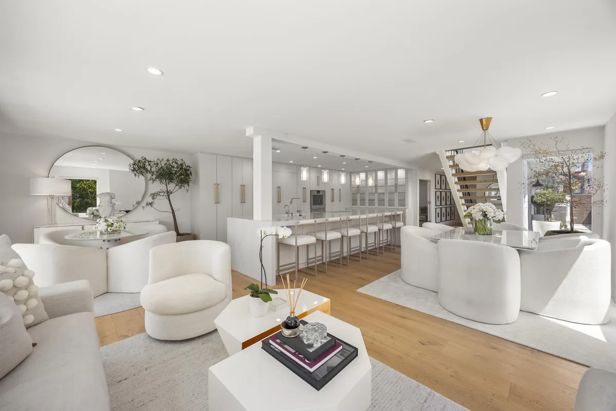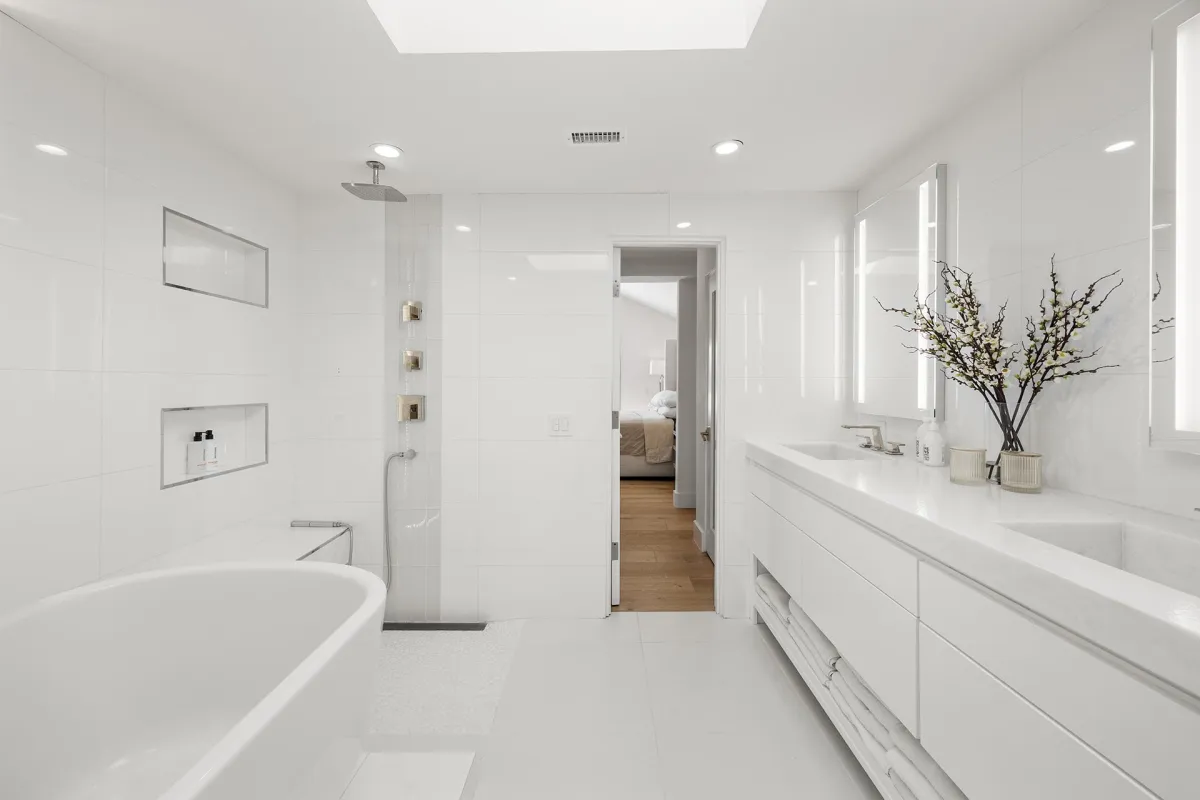 The fully reimagined kitchen is a culinary masterpiece showcasing custom soft-close cabinetry, a 15-foot Cambria Ella luxury quartz island with designer pendants, and premium appliances including a Dacor refrigerator and freezer, Gaggenau electric cooktop, oven and warmer, and Cove dishwasher. The upstairs primary suite is a private retreat offering a spa-inspired bathroom with Kallista bathtub, Porcelanosa tile, a custom vanity, touchscreen steam control mirrors, skylight, and a modern Kohler toilet. The guest bath mirrors this sophistication with Porcelanosa finishes, Kallista shower heads, custom vanity, and steam control mirrors, while the powder room is a showpiece with its custom wall-hung sink and premium fixtures.